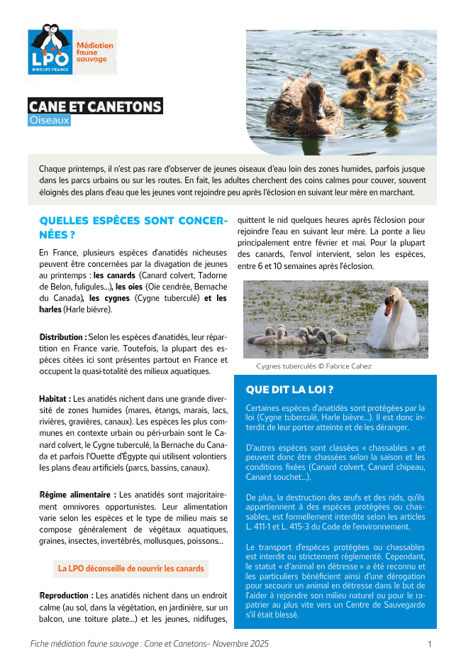 - Canetons abandonnés (>24h) : contacter un centre de soins faune sauvage.