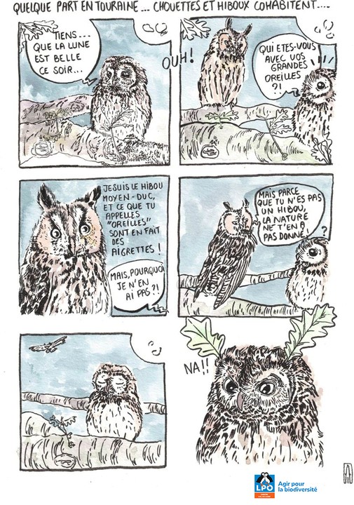 4 planches de bande dessinée présentant la différence entre chouettes et hiboux, leurs milieux de vie ainsi que leurs habitats.