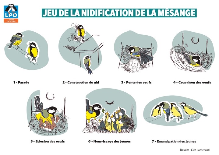 Jeu composé de différentes images représentant les étapes de la nidification de la Mésange charbonnière. Le but est de replacer les images dans le bon ordre afin d’avoir toutes les étapes de la nidification.