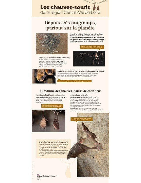 Exposition composée de 10 panneaux autoportants présentant les espèces de chauves-souris communes et emblématiques de Centre-Val de Loire, leurs milieux de vie, ainsi que les menaces qui pèsent sur elles.