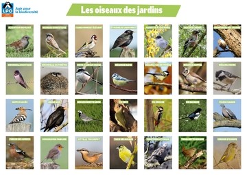 Affiche présentant les oiseaux des jardins de Centre-Val de Loire, avec une description au verso.