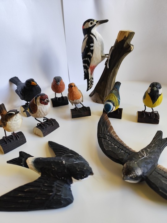 Figurines d’oiseaux des jardins en bois. Espèces disponibles : Martinet noir, Hirondelle de fenêtre, Mésange bleue, Mésange charbonnière, Rougegorge familier, Chardonneret élégant, Merle noir, Troglodyte mignon, Pinson des arbres, Pic épeiche, Martin-pêcheur d’Europe.