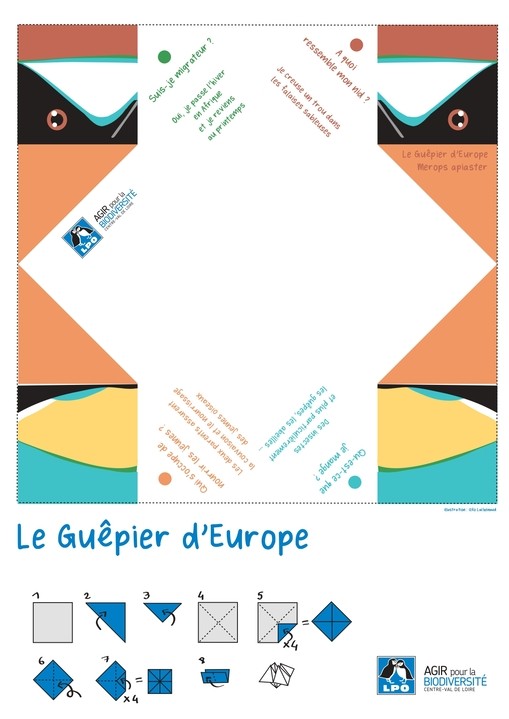 Patron pour faire une cocotte en papier et poser des questions sur l’espèce concernée. Espèces disponibles : Hirondelle de fenêtre, Hirondelle rustique, Sterne naine, Sterne pierregarin, Pic mar, Guêpier d’Europe, Pie-grièche écorcheur.