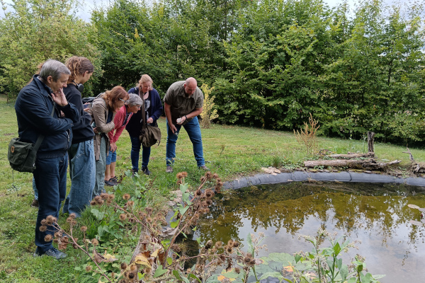Samedi 13 septembre Blandine et Serge ont fait visiter à la communauté des Refuges LPO Axonaise leur superbe refuge : mare, bois, éco-pâturage grâce à des moutons et des chèvres, haie sèche, verger et potager en permaculture ont été source de nombreux échanges. Nous avons également pu observer des abeilles installées à proximité du conduit de cheminée de la maison : une belle cohabitation depuis quelques années. La mare a particulièrement été au centre de beaucoup de questions et d'émerveillements devant la biodiversité qu'elle peut abriter. Ce fut l'occasion de rappeler l'existence du Groupe mare animé par le Conservatoire d'espaces naturels des Hauts-de-France qui œuvre à la protection, gestion et mise en valeur des mares et des zones humides. Il dispense également des conseils pour la création et l'entretien des mares et peut même décerner un label "Mares remarquables".