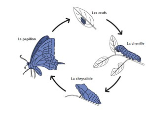 Avant de devenir un insecte ailé, le papillon connait plusieurs transformations successives menant à une métamorphose complète (insecte holométabole1). Il passe par quatre stades : l’œuf, la chenille, la chrysalide, le papillon adulte appelé "imago".