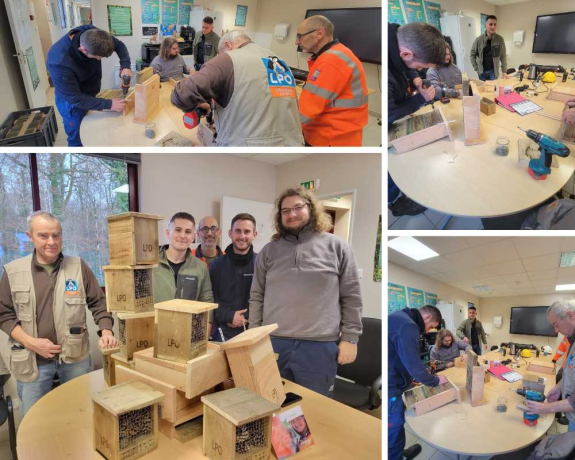 La LPO Champagne-Ardenne a donc réalisé un diagnostic sur le site principal ainsi que sur les 15 puits dans le but de mieux connaître les habitats et les espèces présentes, pour ensuite proposer des modes de gestion et la mise en place d’aménagements efficaces et cohérents sur l’ensemble des sites. Cette dernière action a vu le jour avec l’organisation d’un atelier construction de gîtes à chauves-souris et petits hôtels à insectes à destination des salariés du site de Trois-Fontaines. Ces aménagements seront placés à différents endroits du site afin d’offrir un refuge pour ces espèces en déclin.