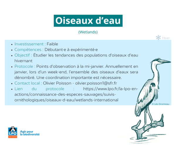 - Protocole : Points d'observation à la mi-janvier. Annuellement en janvier, lors d’un week-end, l’ensemble des oiseaux d’eaux sera dénombré. Une coordination importante est nécessaire.