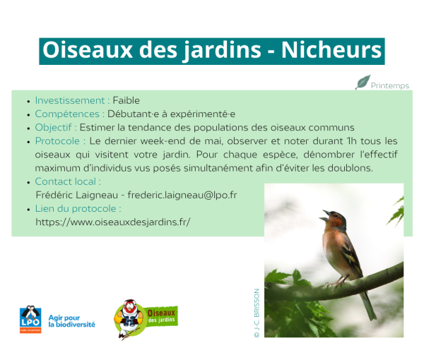 - Protocole : Le dernier week-end de mai, observer et noter durant 1h tous les oiseaux qui visitent votre jardin. Pour chaque espèce, dénombrer l'effectif maximum d’individus vus posés simultanément afin d’éviter les doublons.