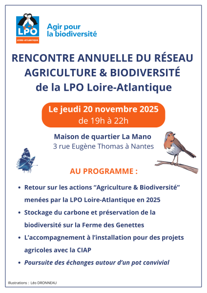 Afin de valoriser des actions mises en œuvre sur les fermes en faveur de l’accueil de la biodiversité, la LPO Loire-Atlantique organise chaque année la « Rencontre Annuelle de son réseau Agriculture & Biodiversité ».