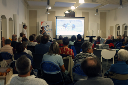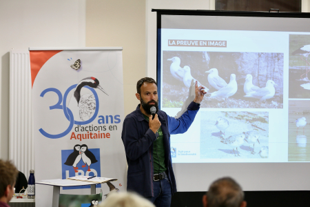 Ainsi, des invités en présentiel ou en vidéo se sont succédés au fur et à mesure de la matinée pour témoigner de moments clés de l’histoire de notre association en Aquitaine. Claude Feigné, bénévole historique, est revenu sur la création de l’antenne en 1995. Ensuite, Laurent Couzi, premier salarié de l’antenne et à présent responsable du service connaissance de la LPO France, est venu témoigner de son arrivée en 1998, ainsi que de la naissance de Faune Aquitaine (une plateforme de sciences participatives, à présent Faune Nouvelle-Aquitaine), en 2008. Bernard Laporte, bénévole de longue date, a retracé l’histoire du Festival de la Bernache (aujourd’hui Vos Rendez-vous avec la Bernache), dont la première édition a eu lieu en 2012. Puis Jean-Paul Urcun, coordinateur de l’équipe d’étude de la migration, a conté à l’assemblée l’histoire de la location du Col d’Organbidexka, lieu majeur d’étude de la migration à ce jour encore. Les interventions ont continué avec Yves Verilhac, ancien directeur général et actuel vice-président de la LPO AURA, qui a témoigné du combat contre le braconnage du Bruant ortolan dans les Landes, dont le massacre a pris fin en 2013. Olivier Denoue, l’un des trois directeurs généraux de la LPO France, s’est exprimé sur la fusion de la LPO Aquitaine avec la LPO France en 2018, faisant de l’antenne une délégation de la LPO France. Enfin, Amandine Theillout, responsable de l’antenne Dordogne ainsi que Virginie Couanon, responsable de l’antenne Pyrénées-Atlantiques, ont toutes deux présenté les actions de leurs antennes respectives. Olivier Le Gall, le délégué territorial de la LPO Aquitaine, a pris la parole sur les autres dates marquantes de notre frise que vous retrouverez en bas de page.