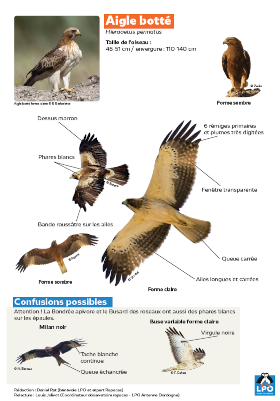 Petit aigle migrateur de la taille d’une buse, il arbore deux « morphes » de coloration de son plumage, « sombre » et « claire », ce qui peut rendre son identification parfois complexe. L’Aigle botté affectionne la Dordogne pour ses grandes forêts de feuillus en pente surplombant des cours d’eau, et des plaines où il y trouve ses proies et de grands arbres pour nicher. Dès son retour dans nos contrées à la mi-mars, on peut le détecter assez facilement grâce à ses cris qu’il émet en vol et les parades spectaculaires réalisées aux heures chaudes de la journée en période de reproduction. L’espèce est en expansion sur le territoire, et semble progresser depuis l’est du département dans les secteurs vallonnés. Quelques sites sont suivis mais de nombreux restent à localiser.