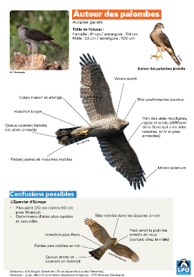L’Autour des palombes est un rapace de taille moyenne qui ressemble à l’Épervier d’Europe (Accipiter nisus), tant pas ses traits physiques que son comportement. On le retrouve dans les massifs forestiers denses de feuillus entrecoupés de conifères dans lesquels il construit un nid de grosse taille au sommet d’un arbre. C’est un spécialiste de la chasse aux oiseaux, il capture de nombreuses proies allant des mésanges à la Corneille noire. C’est un rapace discret et sensibles qui subit la perte de son habitat et les coupes forestières. Il y a ainsi une grande importance à localiser ses sites de nidification.