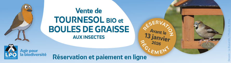 • à la LPO à Poitiers, de 9h30 à 15h (si vous êtes indisponible à cette date, le retrait pourra se faire dans les jours suivants à la LPO).