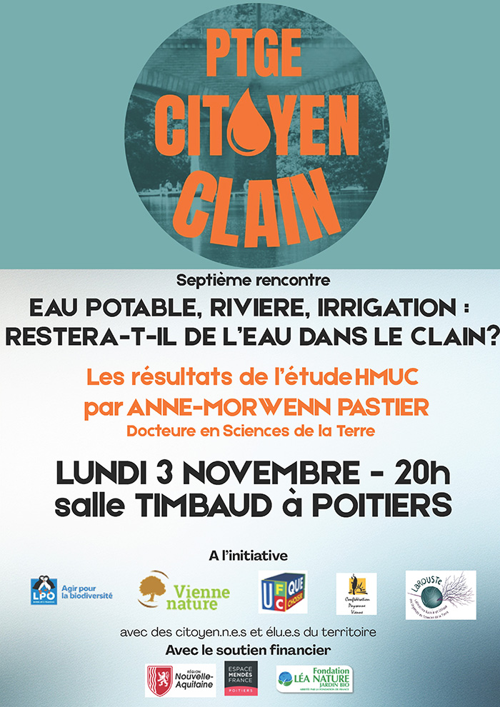 Après 4 ans de travail, l'étude scientifique sur le fonctionnement des cours d'eau et des nappes souterraines du bassin du Clain est terminée et vérifiée : l’étude Hydrologie, Milieux, Usages, Climats (HMUC). Elle fournit les clefs pour comprendre ce qui se passe aujourd'hui dans le bassin du Clain avec le changement climatique. Elle définit ses effets sur la disponibilité future de l'eau.