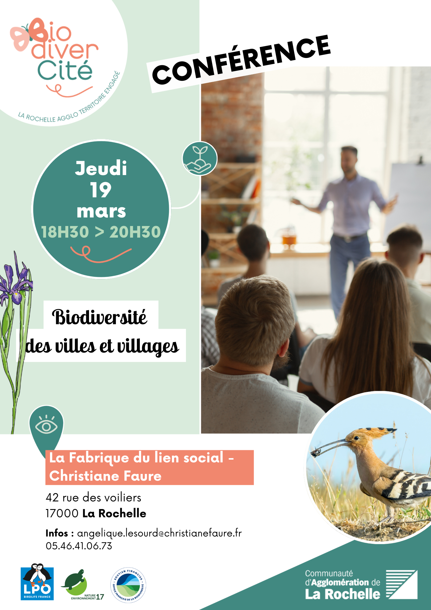 Venez découvrir en parallèle, l'exposition des espèces animales et végétales du territoire du 2 au 31 mars à la La fabrique du lien social Christiane Faure, grâce au projet BiodiverCité financé par Office français de la biodiversité et La Rochelle Agglo.