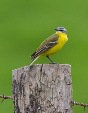Une prairie un jour d’été : une petite élégante aux longues pattes fines, coiffée de gris, poitrail jaune vif et longue queue cherche son repas au sol. Pas de doute, c’est une Bergeronnette printanière !