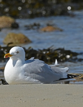 Dans le ciel bleu, un ballet silencieux d’ailes immenses au-dessus de la plage. Vous le connaissez, il s’invite partout…attention à votre sandwich, le chapardeur plonge ! C’est le goéland argenté, l’espèce de ce mois !