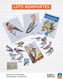 Chaque gagnant·e remporte un guide “Débuter en ornithologie”, un carnet, un magnet LPO et de superbes illustrations de Julien Nowak.