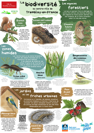 A travers ce poster, repris sur le site de la ville, nous découvrons une variété d’habitats (bois, zones humides, jardins) abritant des espèces comme l’écureuil roux, la chouette hulotte, le triton crêté, des libellules, des oiseaux et des papillons.