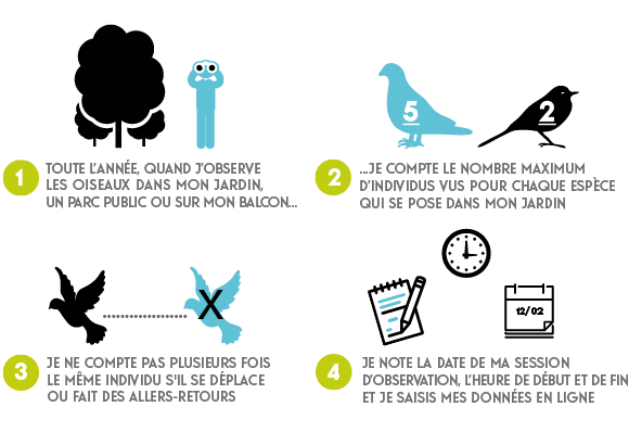 - Pendant une heure lors des deux temps forts de l'année : le dernier week-end de janvier pour les oiseaux hivernants et le dernier week-end de mai pour les oiseaux nicheurs