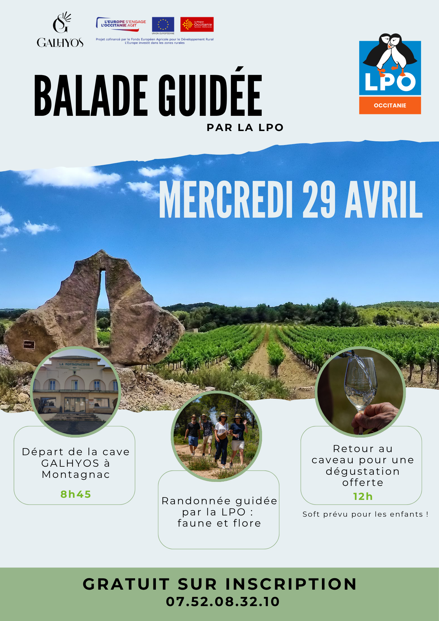 Venez avec nous pour une balade guidée au départ de Montagnac afin de découvrir la faune et la flore de notre région, suivie d'une dégustation d'1h offerte au caveau accompagnée d'une animation viticole.