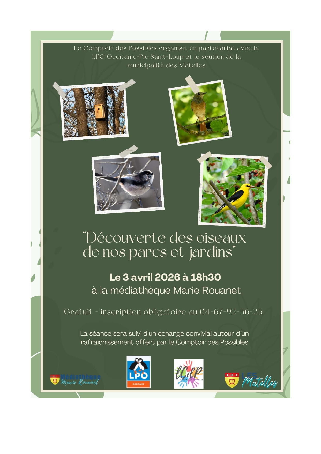 Venez découvrir les oiseaux de nos jardins avec notre diaporama, qui sera suivi d'un échange autour d'un rafraîchissement offert par le Comptoir des Possibles