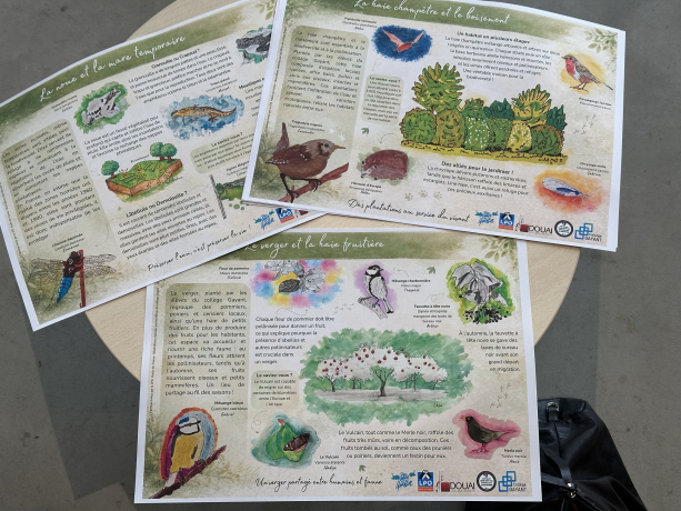 Après les plantations réalisées avec la Ville de Douai, les habitants et le collège Gayant, qui ont permis de transformer un ancien terrain de football en véritable espace de nature, le projet continue avec la création de panneaux pédagogiques destinés à faire découvrir la biodiversité du site. Ces panneaux ont été illustrés à partir des dessins réalisés par les collégiens, pleinement impliqués dans le projet depuis ses débuts.